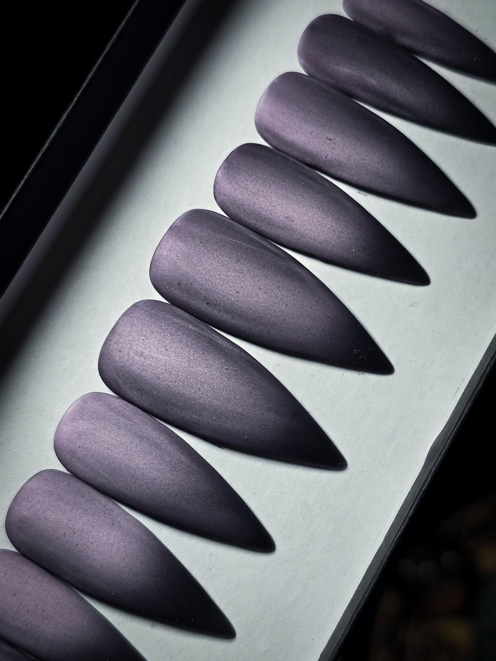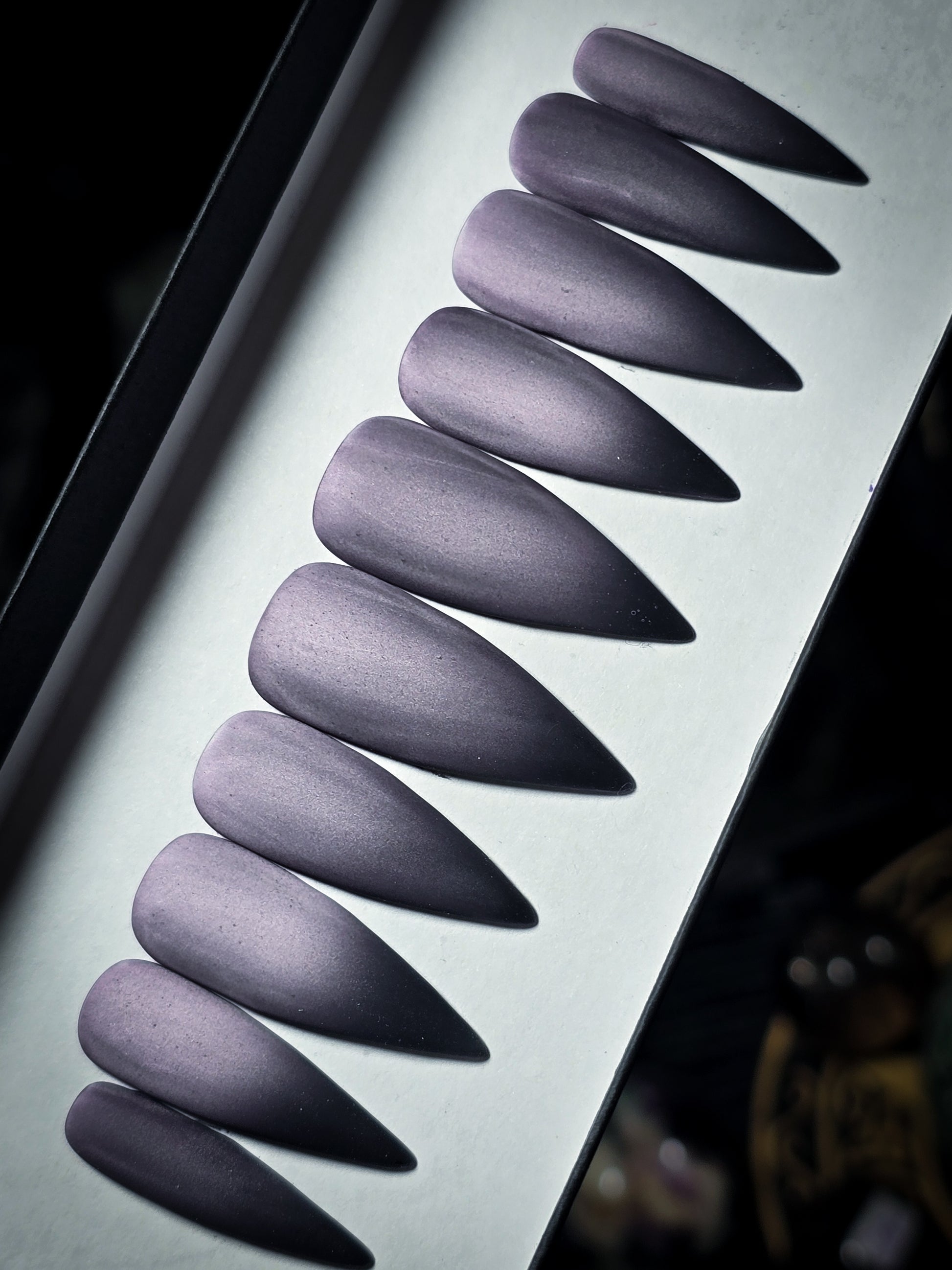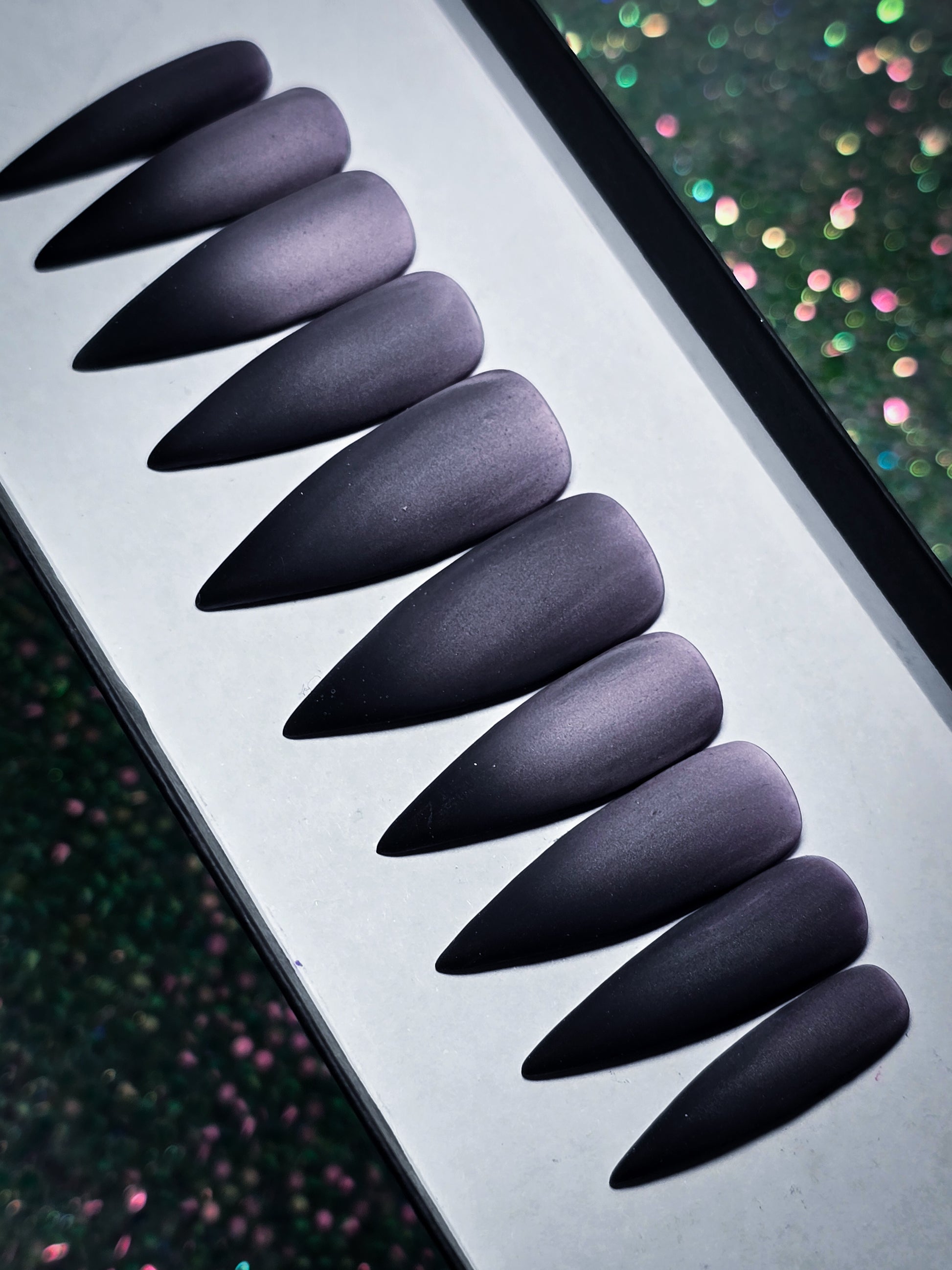 Embrace your inner darkness with my Casting Shadows Press on Nail Set—where gothic glamour meets effortless elegance. These stunning matte cat eye nails feature a mesmerizing ombre effect that shifts across your fingertips, creating an edgy, mysterious vibe perfect for any dark aesthetic lover. Pre-sized for instant application, no salon visit needed. Whether you're channeling witchy energy or just love that moody, dramatic look, these claws deliver serious attitude with zero commitment. Slip them on and let your nails do the talking.