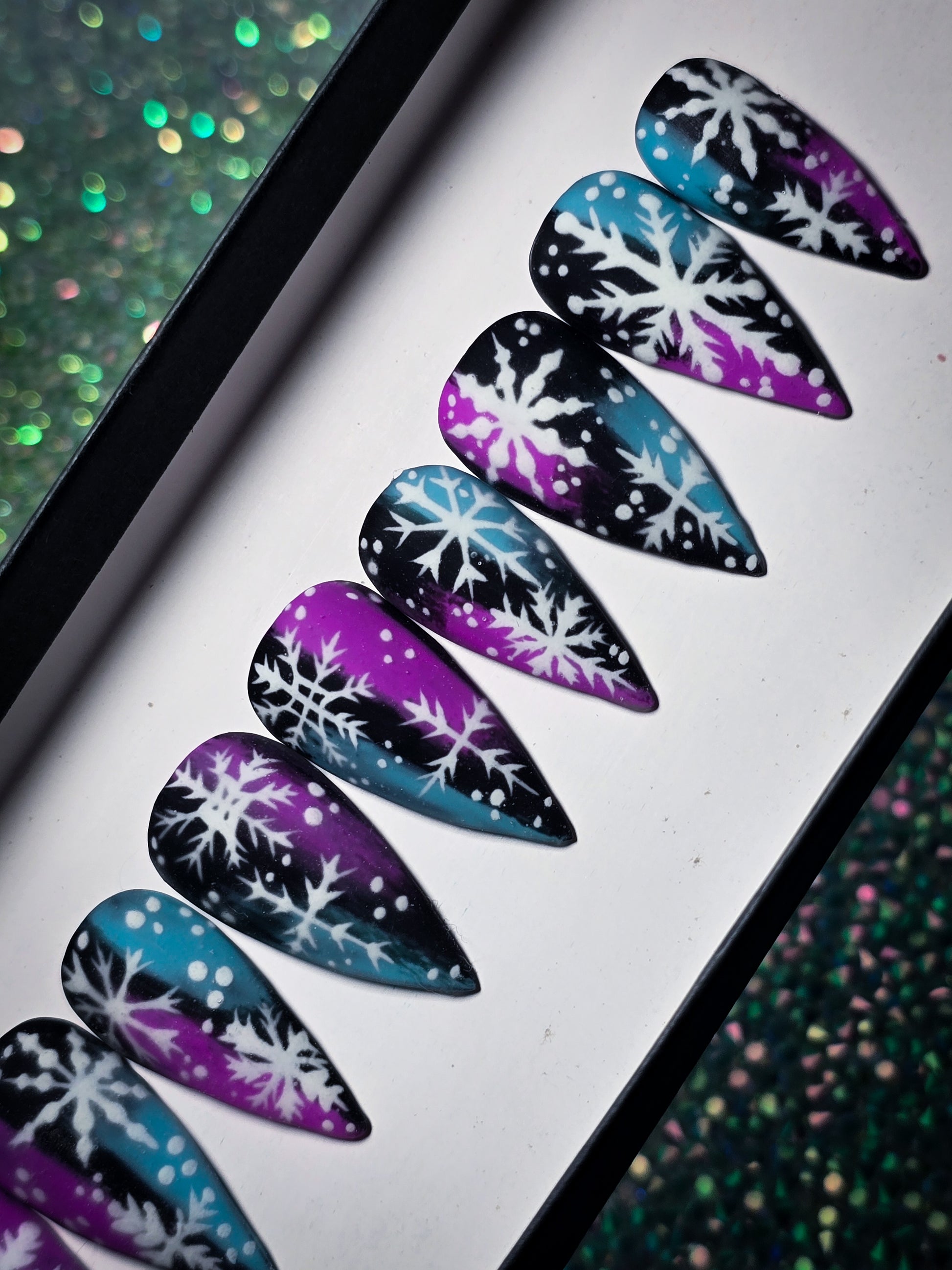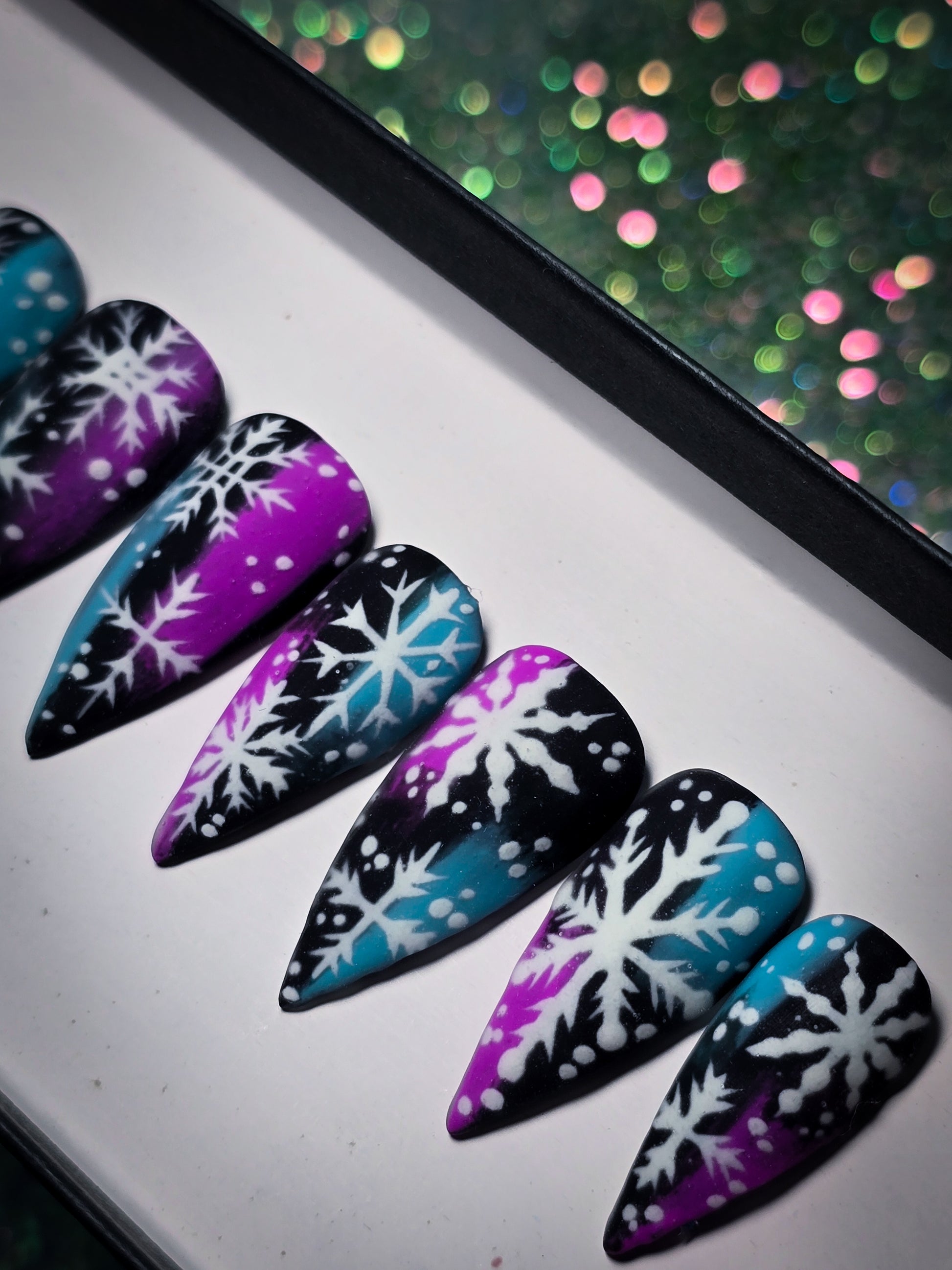 Step into the cosmic winter wonderland with these mesmerizing press-on nails! Each set features a stunning blend of deep black, electric teal, and vibrant fuchsia that captures the magic of a starlit night. Hand-painted white snowflakes glow brilliantly in the dark, adding an enchanting touch that'll make your nails the talk of the room. Perfect for holiday parties, winter vibes, or whenever you want to bring some celestial sparkle to your fingertips. Easy application, zero commitment, maximum impact.