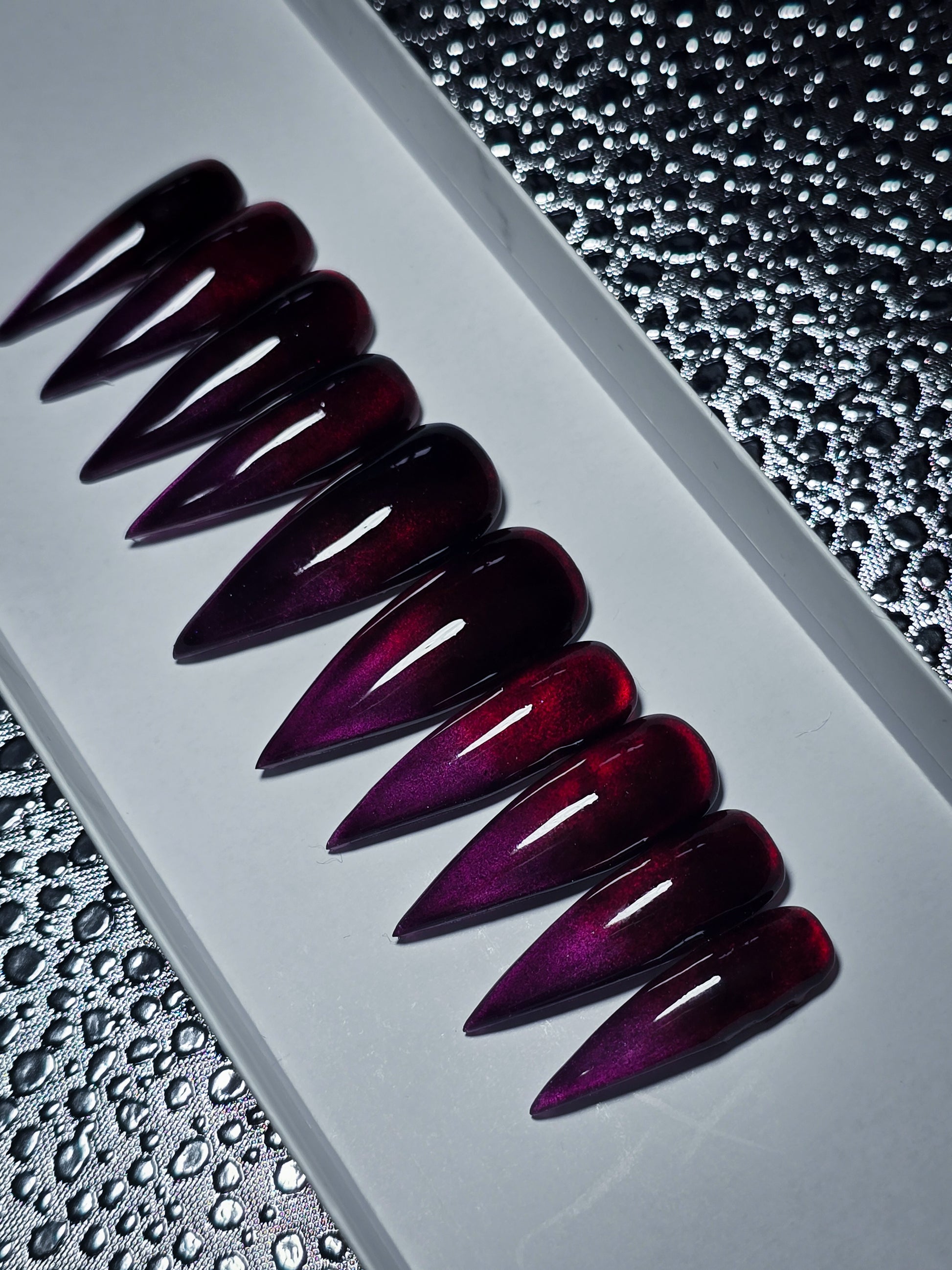 Unleash your inner goth goddess with the Crimson Eclipse Press on Nail Set—where deep crimson meets mysterious purple in a mesmerizing ombre that'll have everyone asking for your nail artist's number. These cat eye beauties feature a sultry gradient that transitions from rich red at the base to moody purple tips, giving you that effortless "I woke up like this" vibe. Perfect for adding some dark, dramatic flair to any look without the salon commitment.