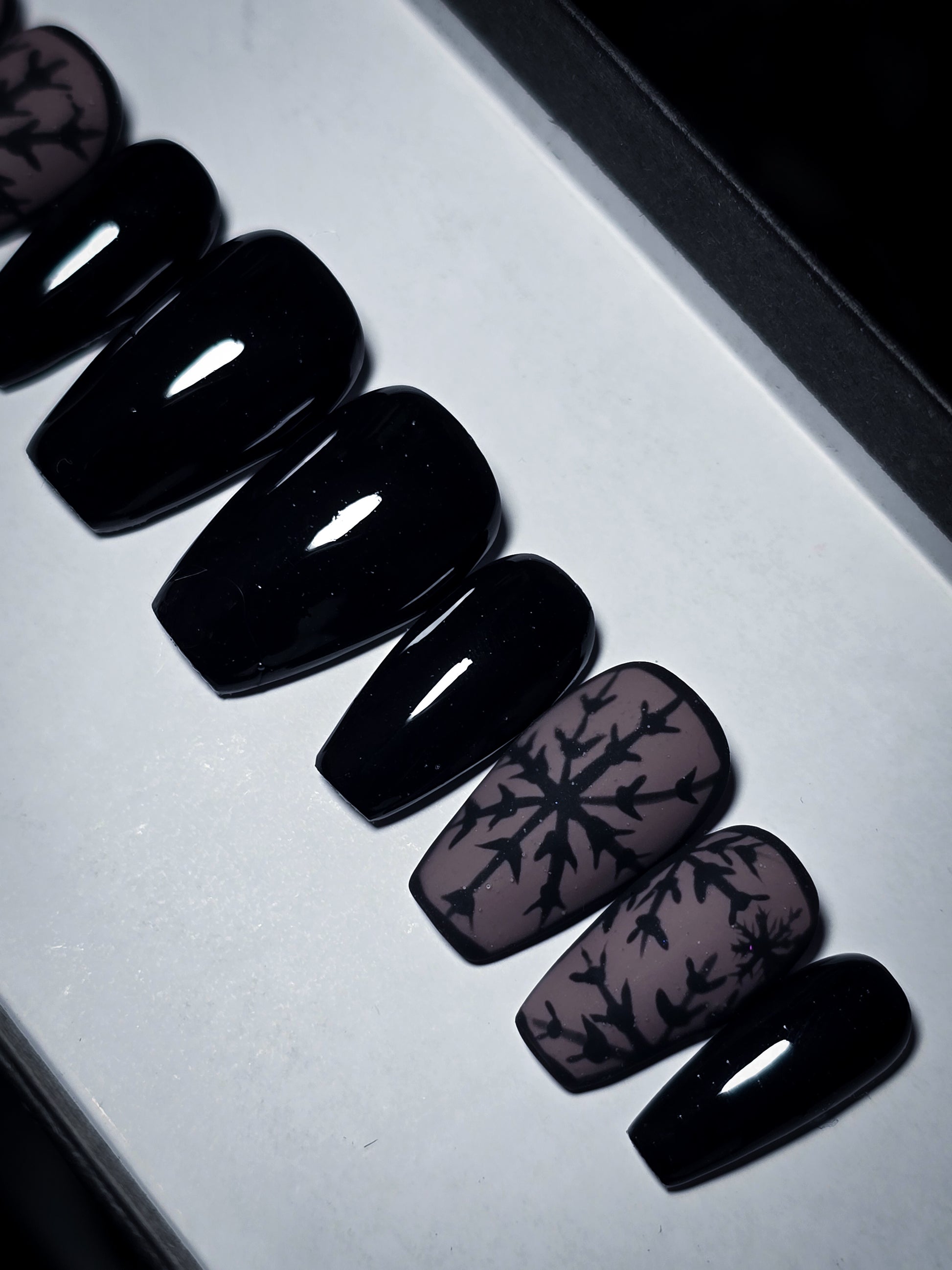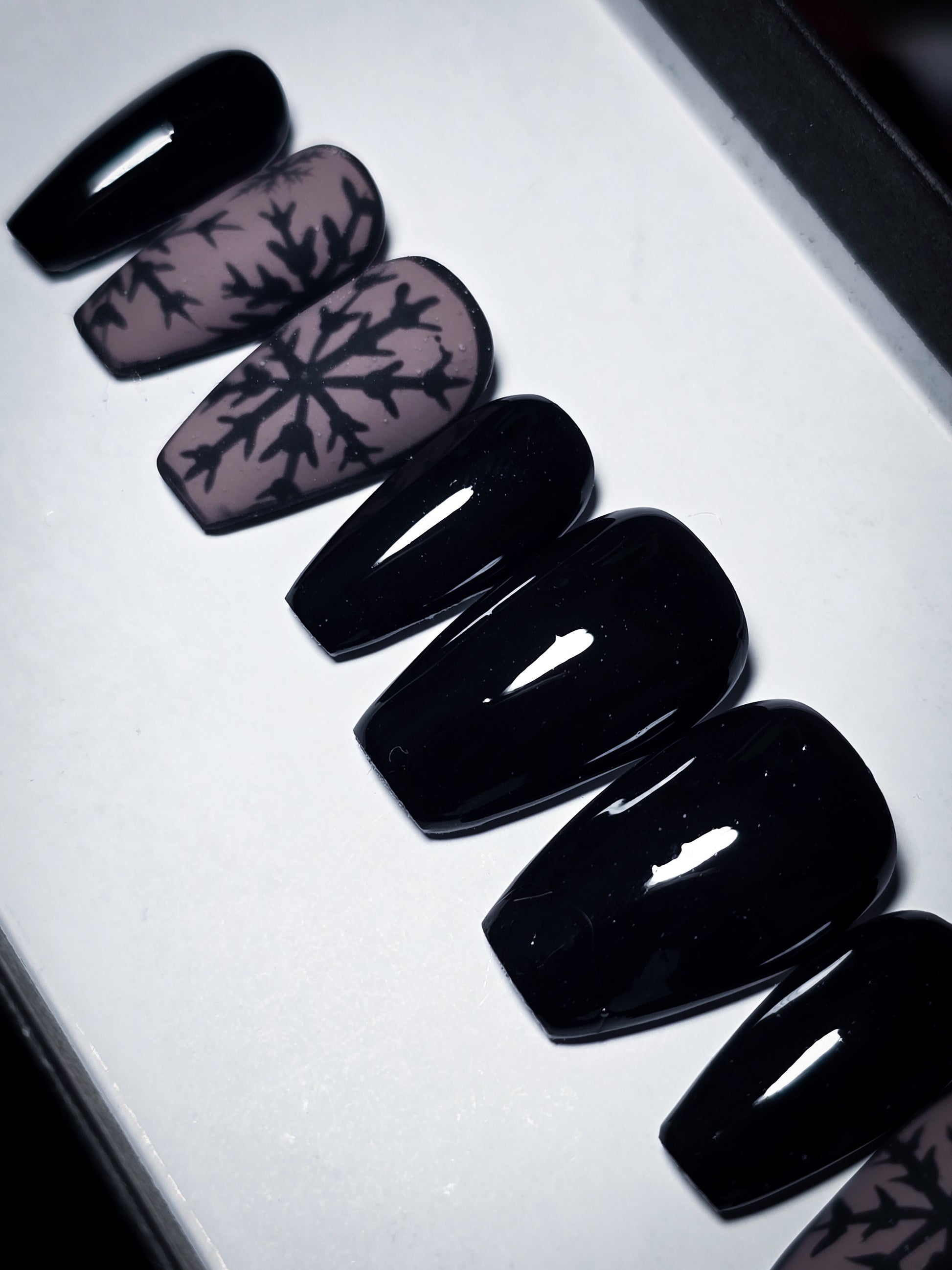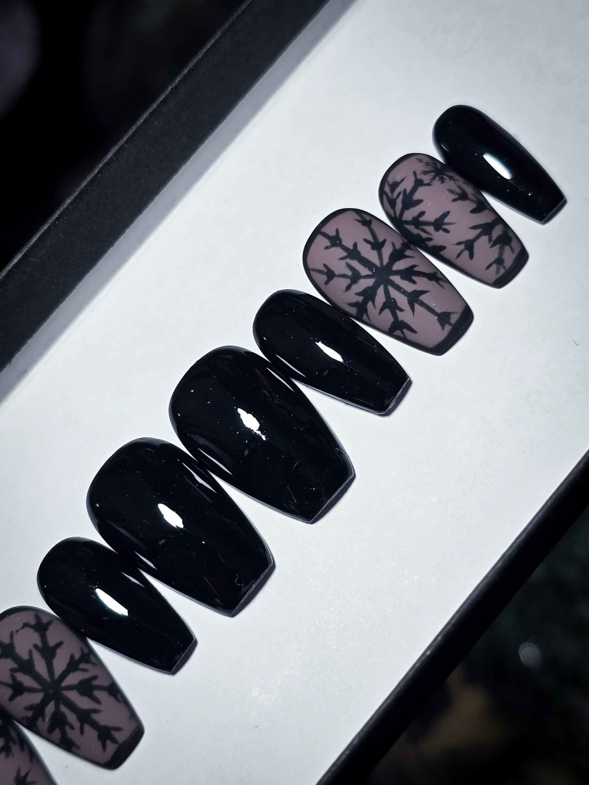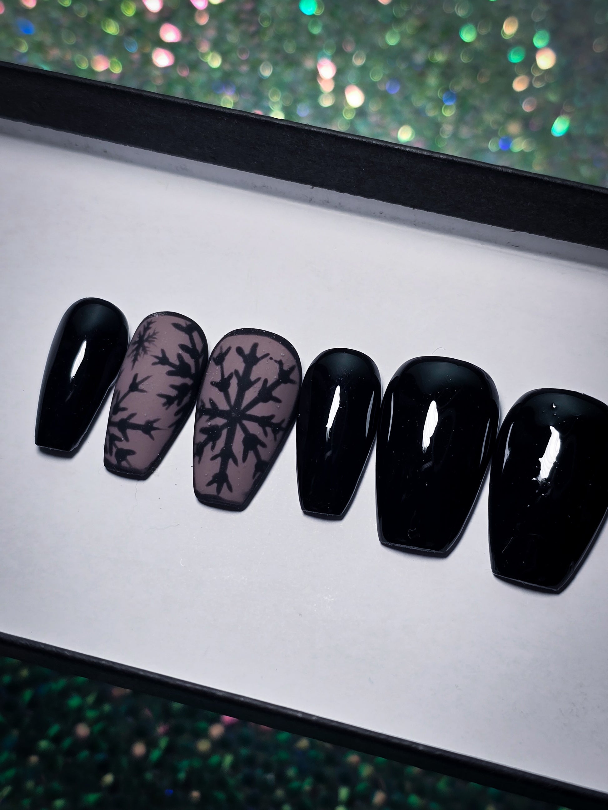 Embrace the darker side of winter with this moody press-on nail set. Featuring sleek black and grungy grey nude accents adorned with hand-painted snowflakes, these nails deliver a deliciously edgy take on seasonal style. Perfect for anyone who prefers their winter aesthetic with a gothic twist—think cozy vibes meets mysterious charm. Each set is crafted for a flawless fit and effortless application, letting you rock that cold-weather aesthetic without the commitment. Winter just got a whole lot cooler.