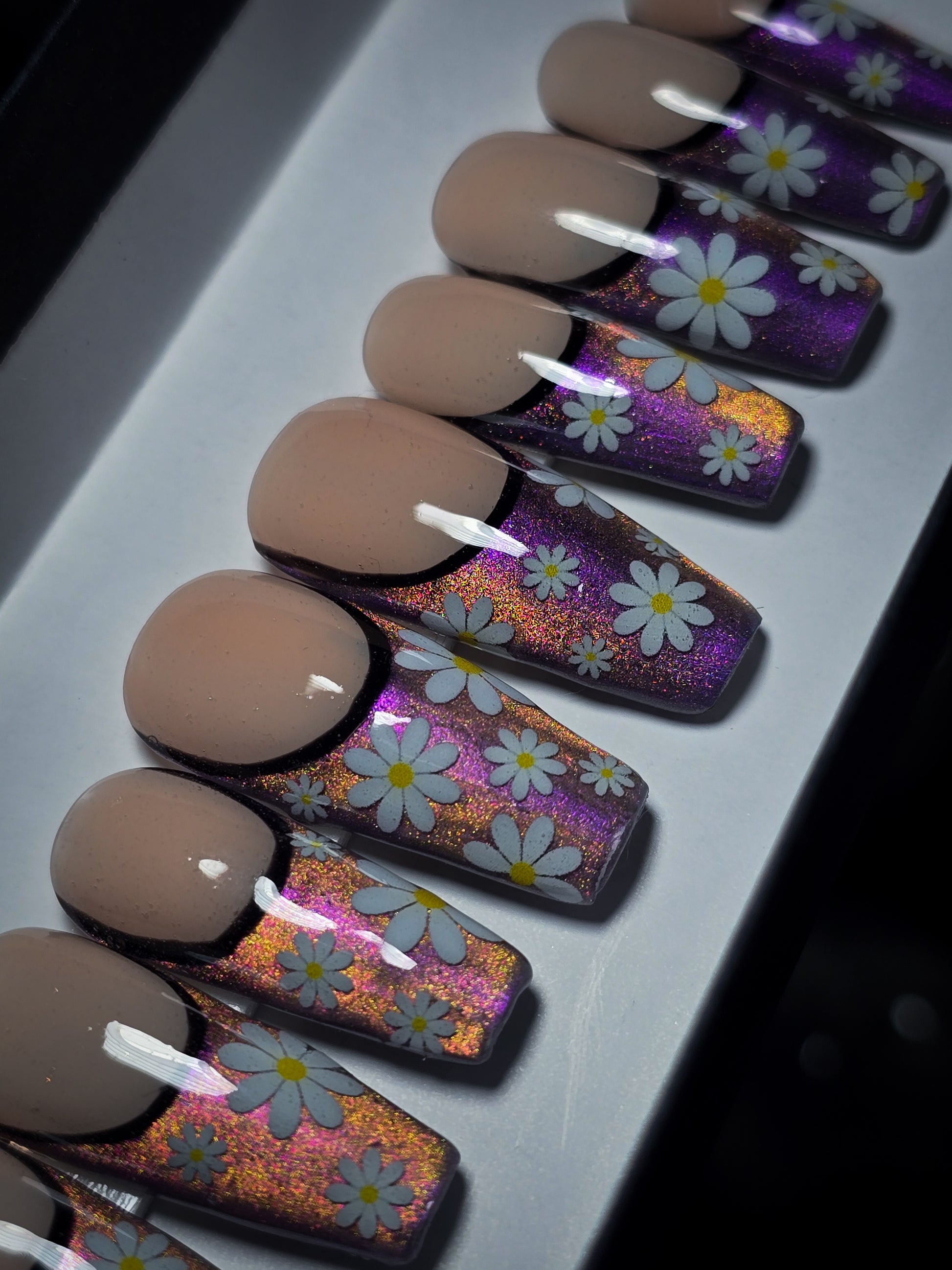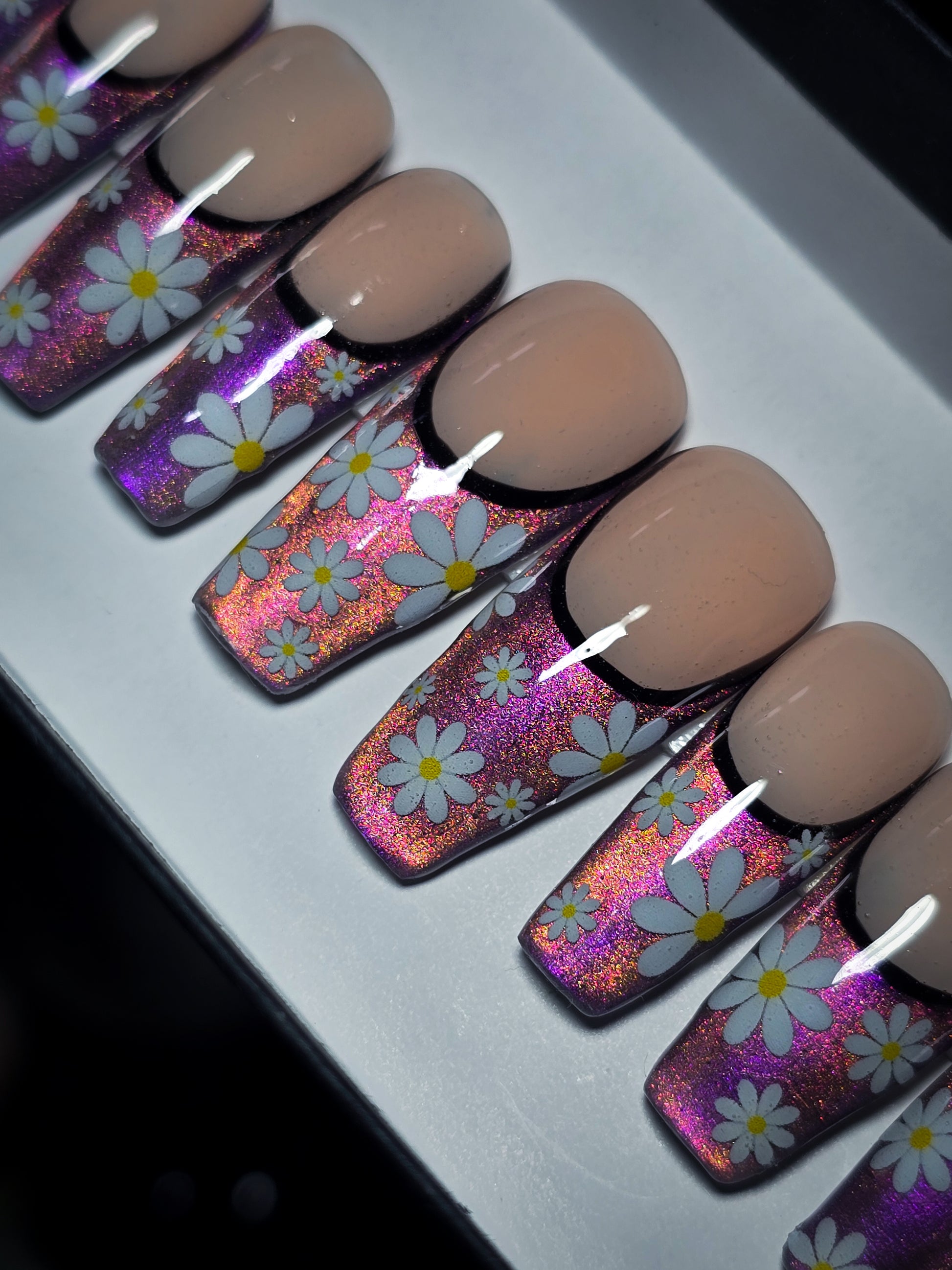 Get ready to turn heads with these show-stopping press-on nails! Each of the 10 nails features a chic nude base paired with bold cat-eye tips in purple and orange. The real magic? Gorgeous daisy nail art adorning every single nail for maximum impact. Perfect for adding a pop of floral flair to any look, these nails are all about celebrating your wild side with style. Apply, admire, and let your fingertips do the talking!