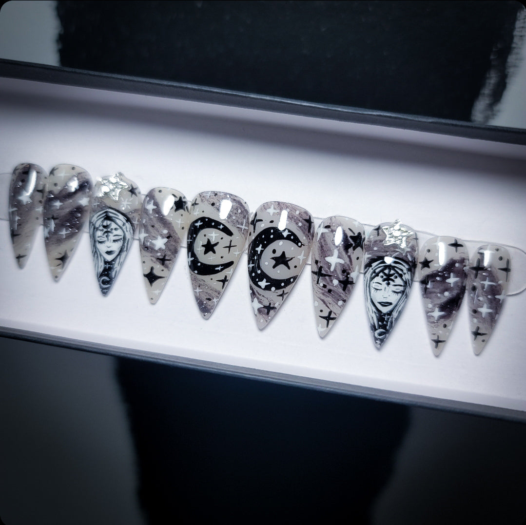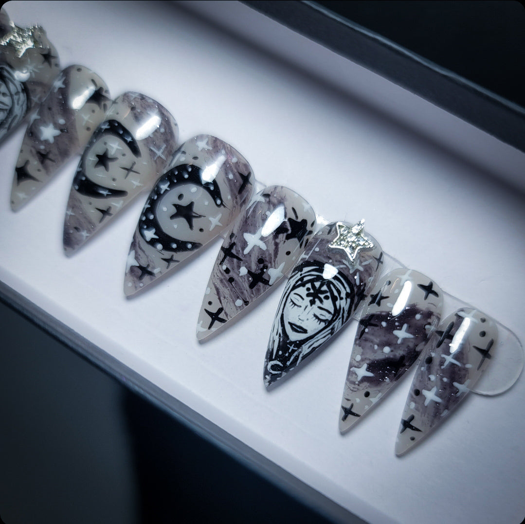 Unleash your inner celestial being with my Galaxy Goddess nail design. This hand painted nail art is truly out-of-this-world, featuring a thermal black to white effect when exposed to warmer temperatures. Get ready to flaunt a unique and playful look that's truly one-of-a-kind.