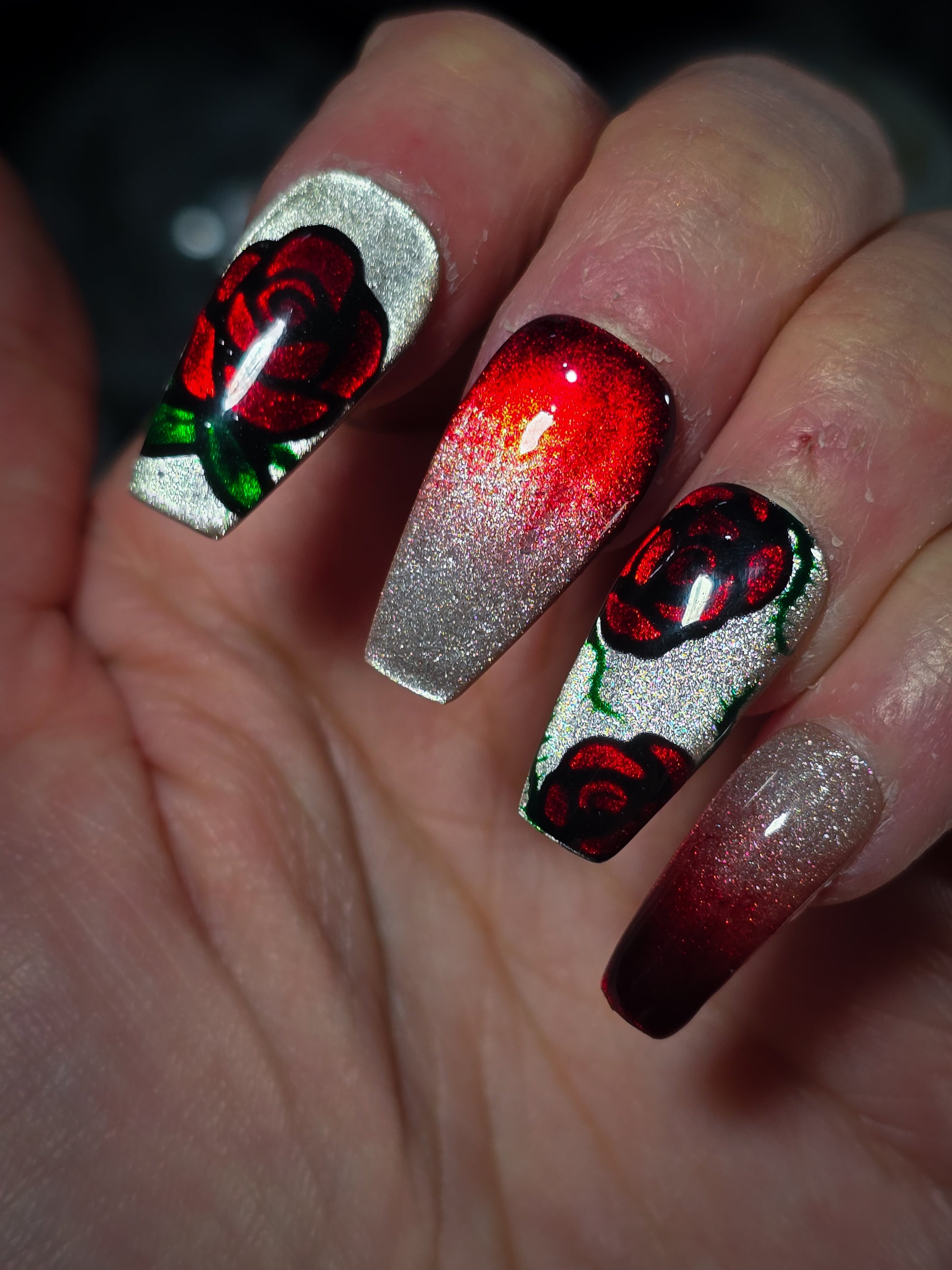 Elevate your manicure game with the Gilded Rose Press on Nail Set—where elegance meets edge. These stunning nails feature a champagne cat eye base that catches the light beautifully, transitioning into a bold ombre of rich red tips. Two accent nails showcase intricate hand-painted rose artwork, adding a touch of artistic flair. Perfect for anyone who wants glamorous nails without the salon commitment, this set delivers salon-quality results in seconds. Mix sophistication with a hint of sass and watch heads turn.