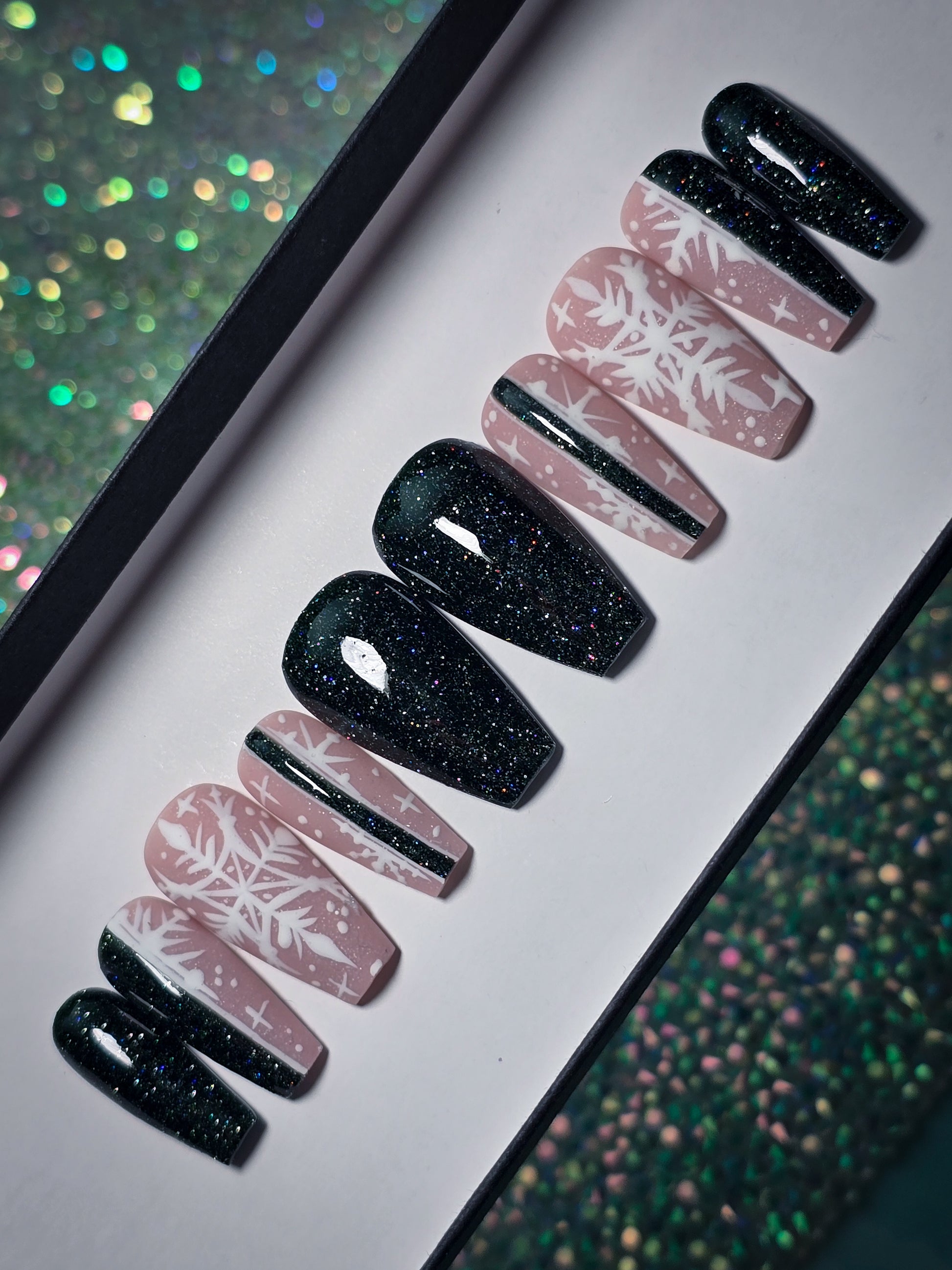 Embrace the magic of winter with my Glittering Frost Press on Nail Set! This enchanting collection features a stunning trio of designs: deep forest green with shimmering glitter that catches the light, creamy nude tones, and crisp white accents. Each set showcases delicate hand-painted snowflake details on the nude nails, bringing a touch of frosty elegance to your fingertips. Perfect for holiday parties, winter weddings, or whenever you want to sparkle with seasonal charm. Easy to apply and reusable, these press-ons deliver salon-quality results in minutes. Let it snow on your nails!