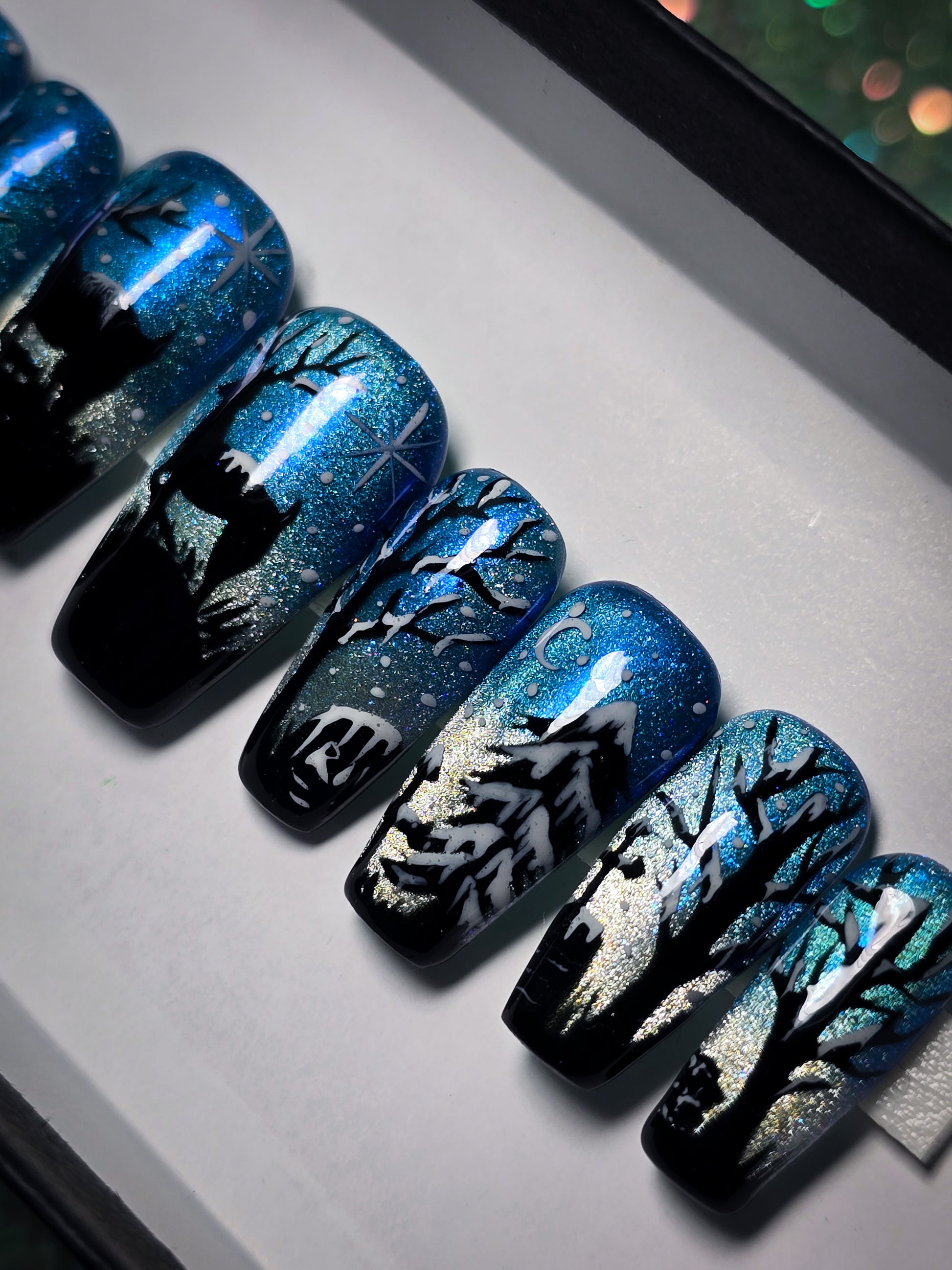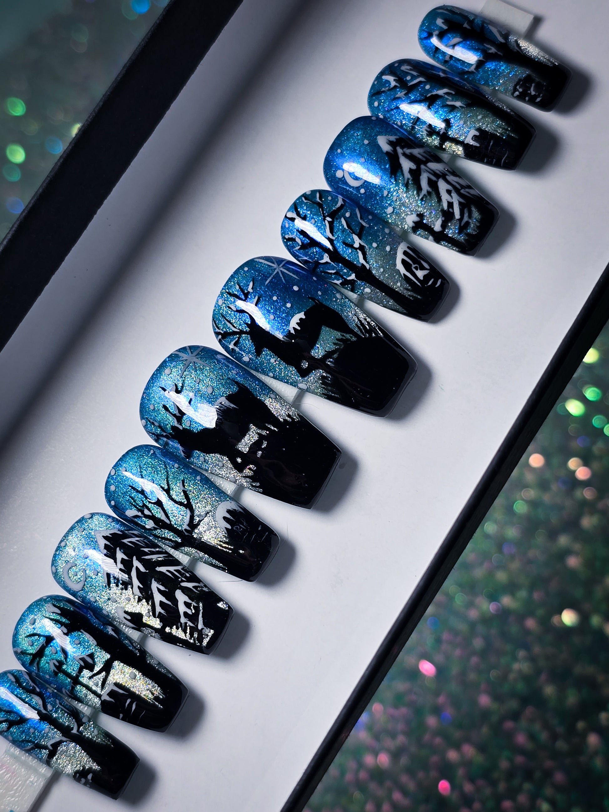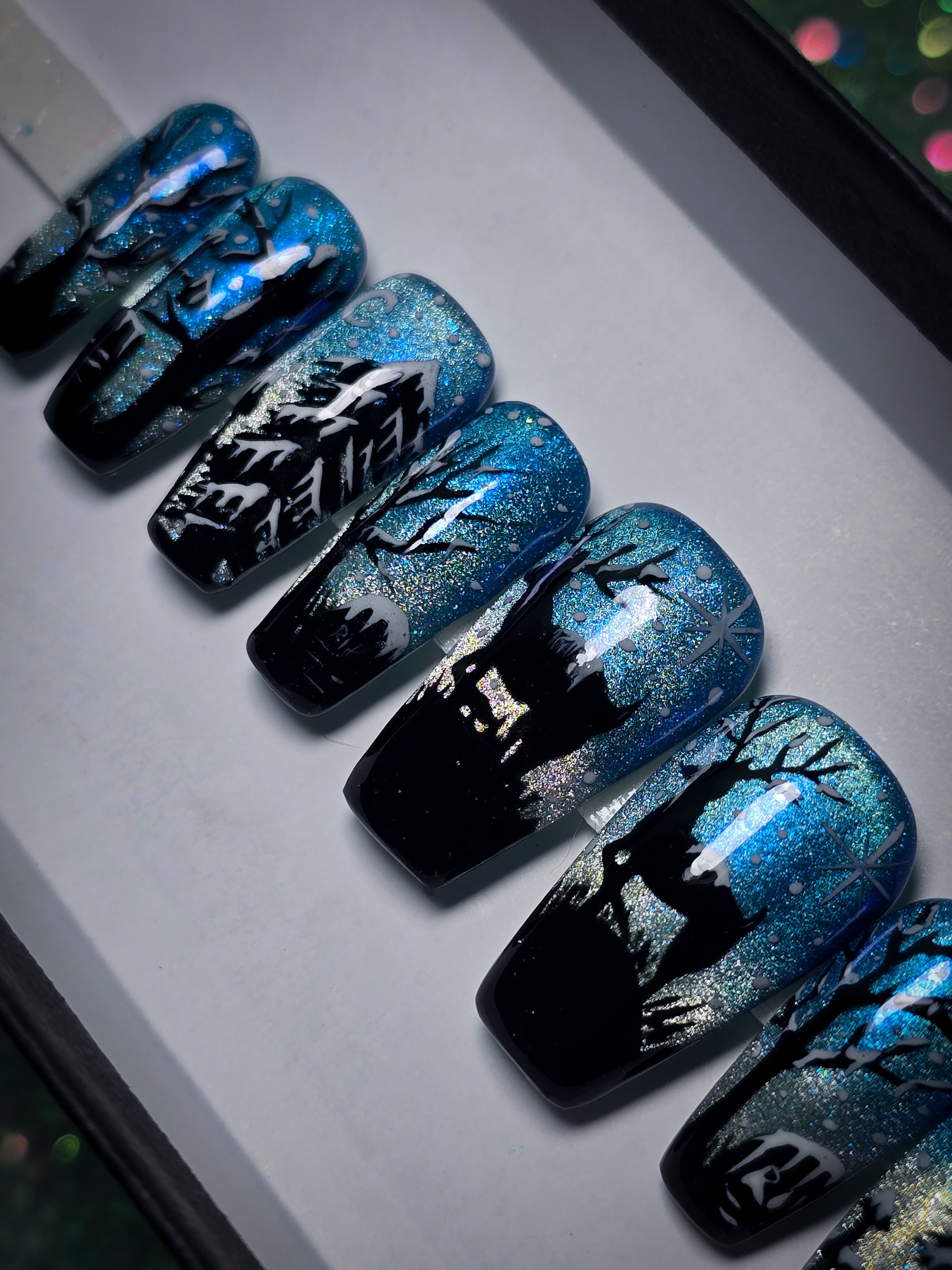 Step into a winter wonderland with these enchanting press-on nails featuring a mesmerizing ombre cat eye effect. Each nail showcases hand-painted silhouettes of a moonlit forest and graceful deer, creating a shimmering landscape that dances across your fingertips. Perfect for adding a touch of magical, wintry glamour to any look, these nails blend nature-inspired artistry with modern nail trends. Whether you're channeling your inner woodland witch or simply craving some seasonal sparkle, these beauties deliver instant drama and whimsy without the salon visit.