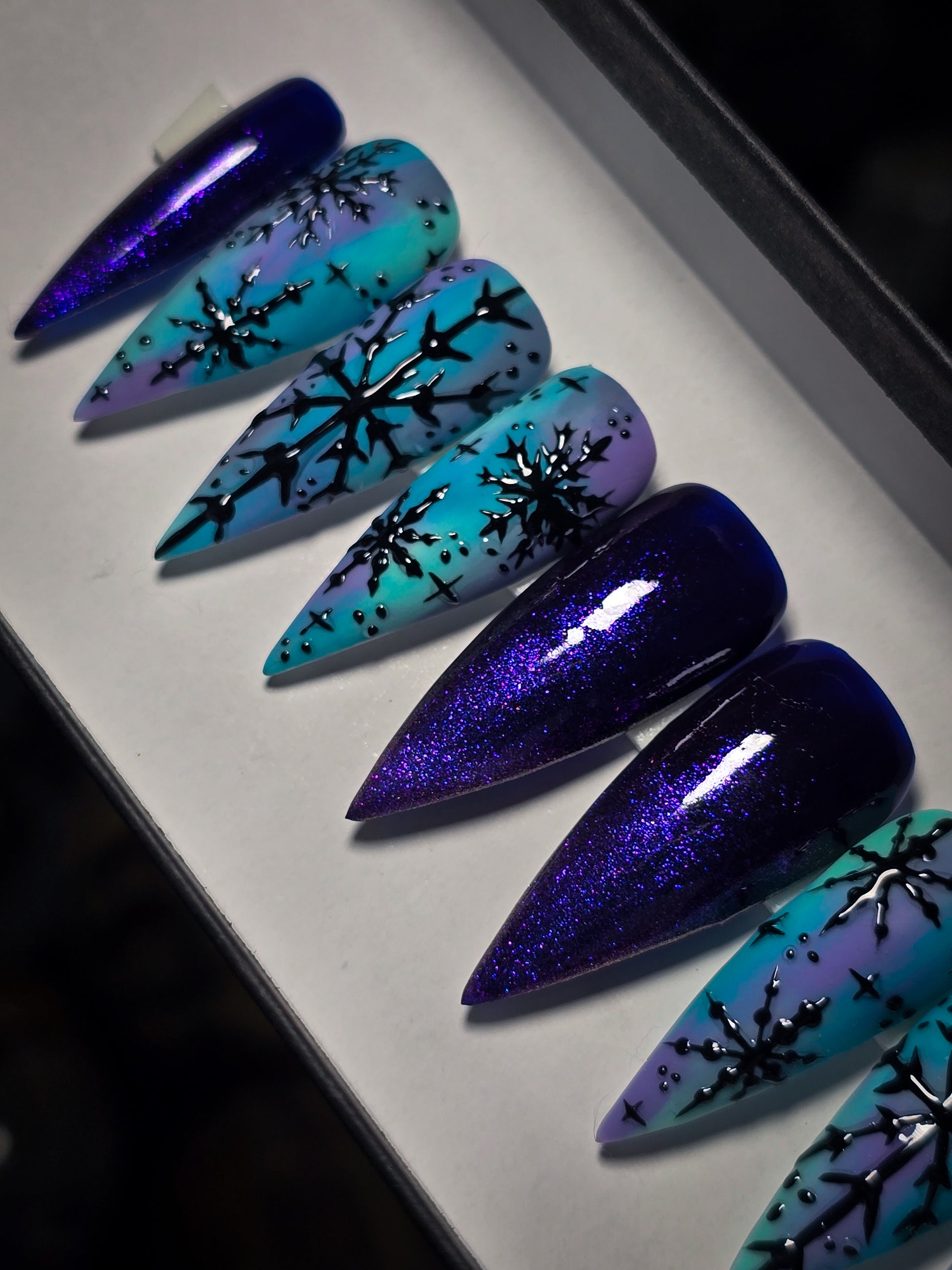 Step into the enchanted season with Mystic Winter press-on nails—where frosty vibes meet supernatural glow. This captivating set features mesmerizing blue and purple winter tones that capture the magic of a moonlit night. Two nails shimmer with dazzling glitter accents, while three nails glow eerily in the dark, creating an otherworldly effect. Perfect for adding a touch of mystical charm to your winter look, whether you're hitting the town or just embracing your darker aesthetic. Easy to apply, instantly transformative, and absolutely spellbinding.