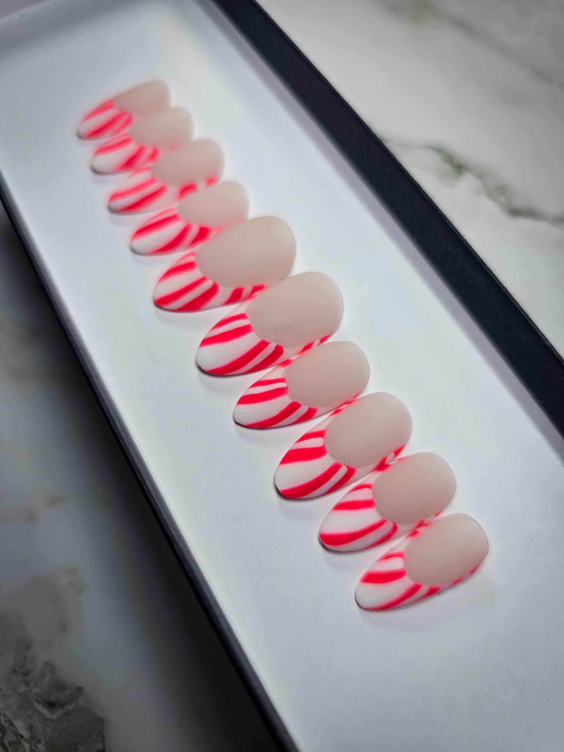 Transform your nails with my Peppermint Glow Press on Nails! These French manicure nails take a fun twist with a white and red peppermint design that glows in the dark! Dare to stand out and make a statement with these bold and adventurous nails!