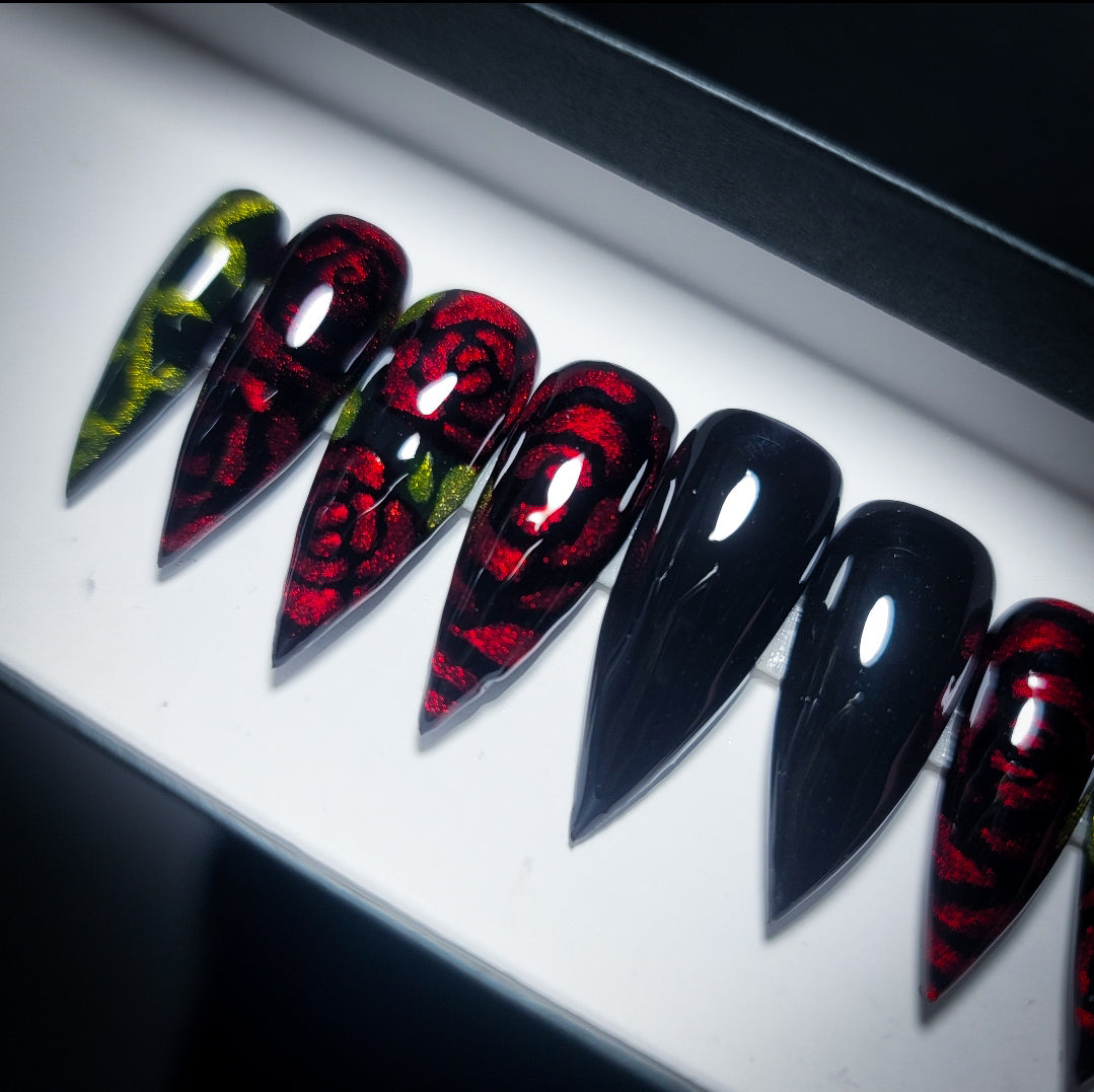 Feel sexy and sleek with my hand painted Romance Press on Nail Set! Featuring a black base and red chrome rose nail art, this stunning set is perfect for a night out