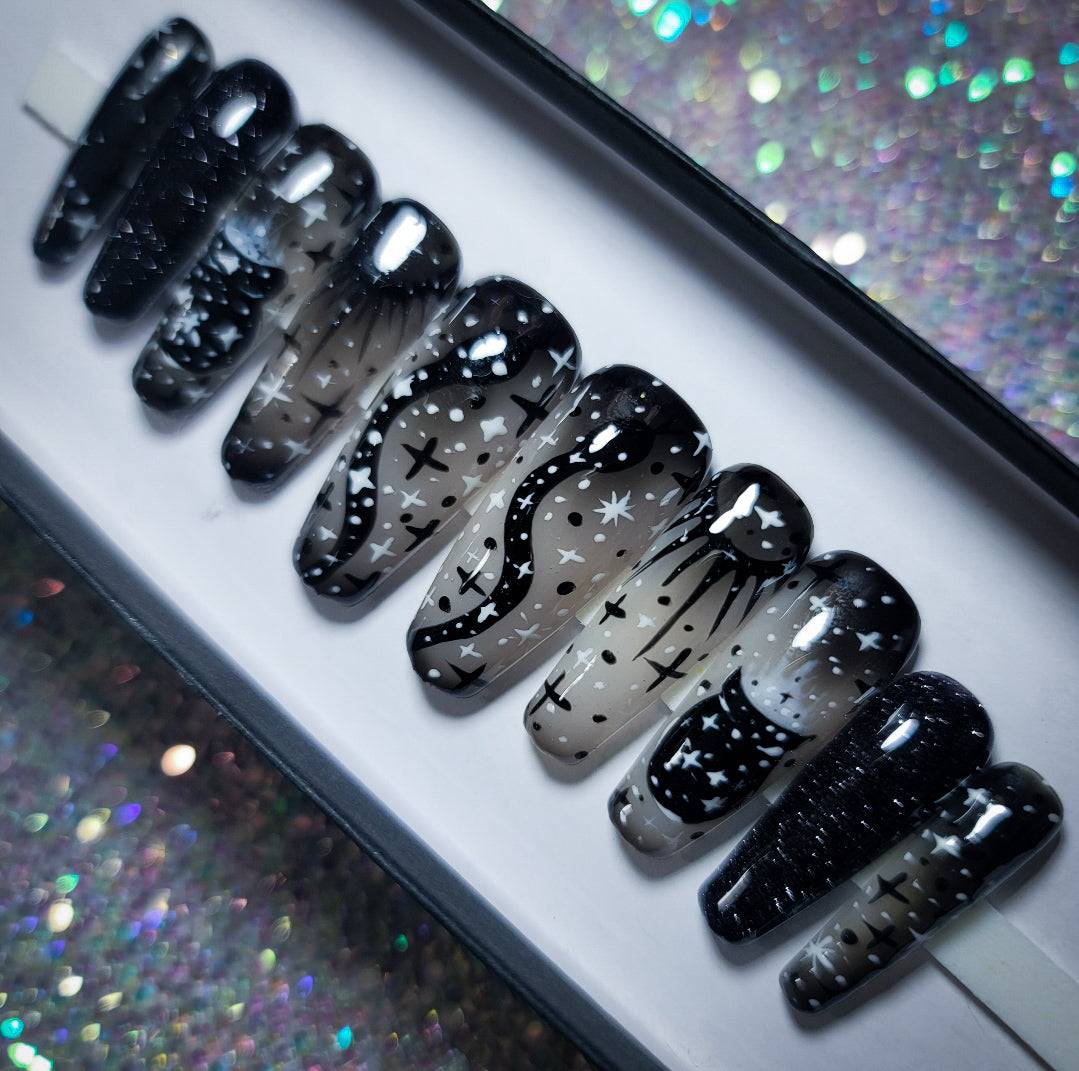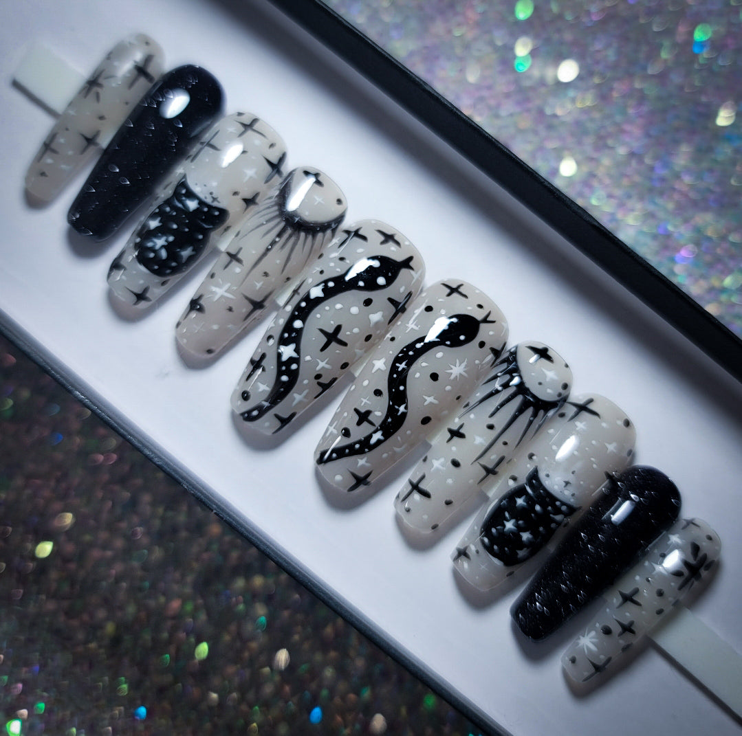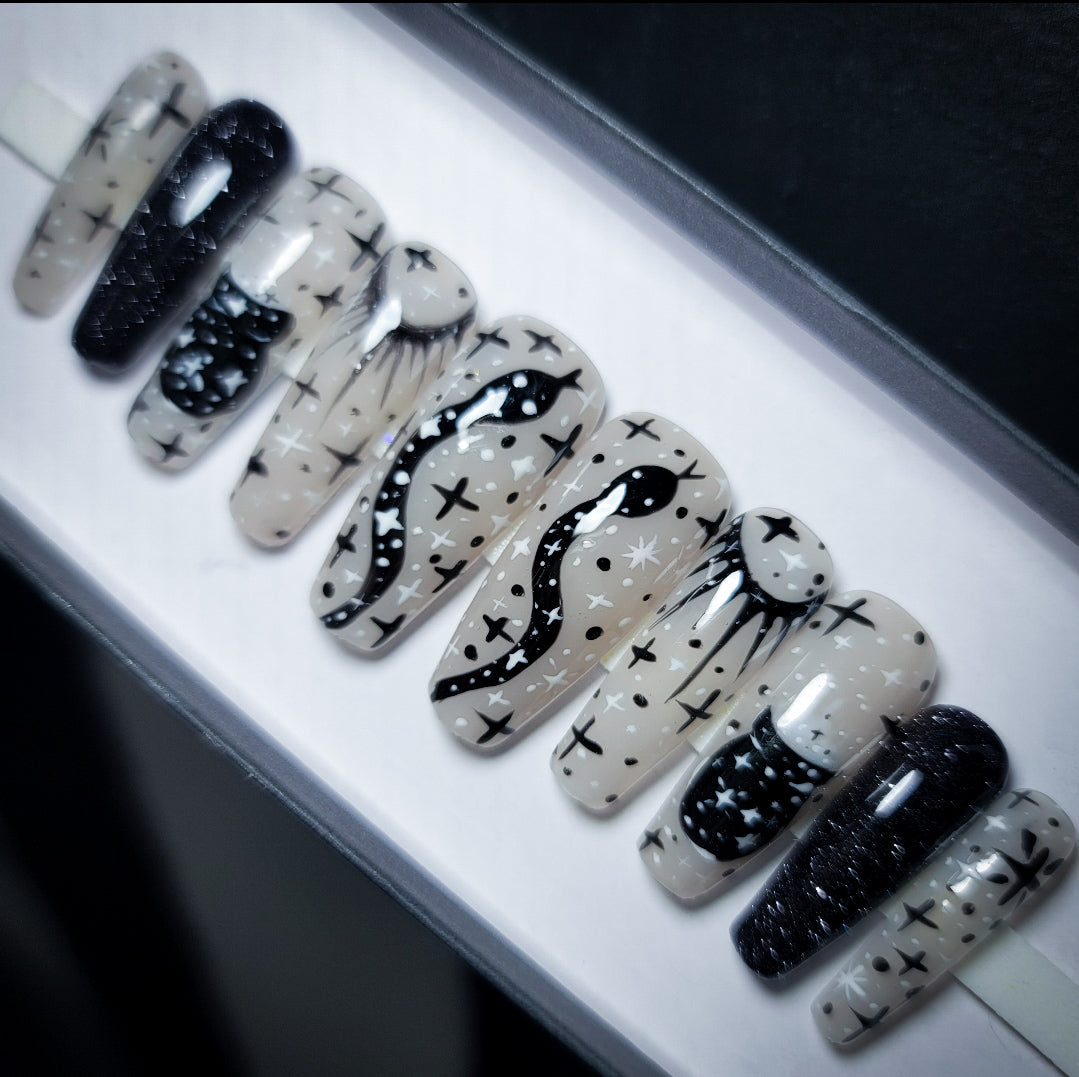 spellbinding is a stunning thermal changing nail design which gives you TWO nail designs in ONE! in colder temperatures its a Black based nail design with Star nail art but when in Warmer Hot temperatures it transforms to a white based nail design with stunning witchy nail art! this design is fun for everyone!