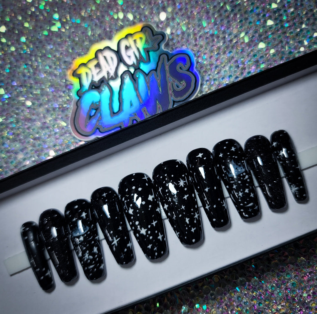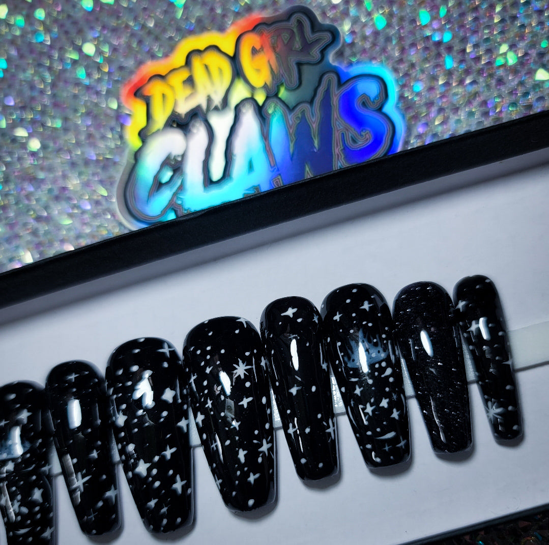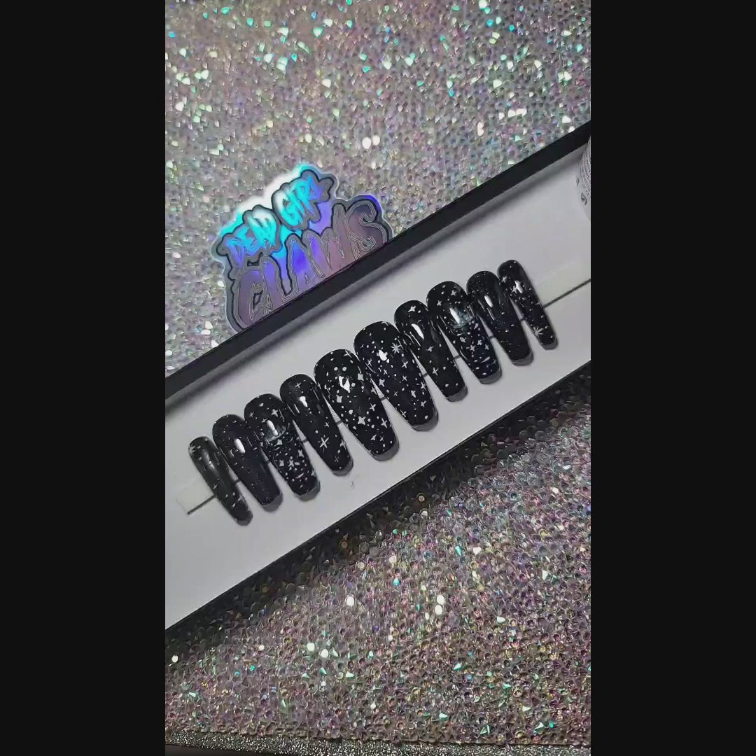 spellbinding is a stunning thermal changing nail design which gives you TWO nail designs in ONE! in colder temperatures its a Black based nail design with Star nail art but when in Warmer Hot temperatures it transforms to a white based nail design with stunning witchy nail art! this design is fun for everyone!