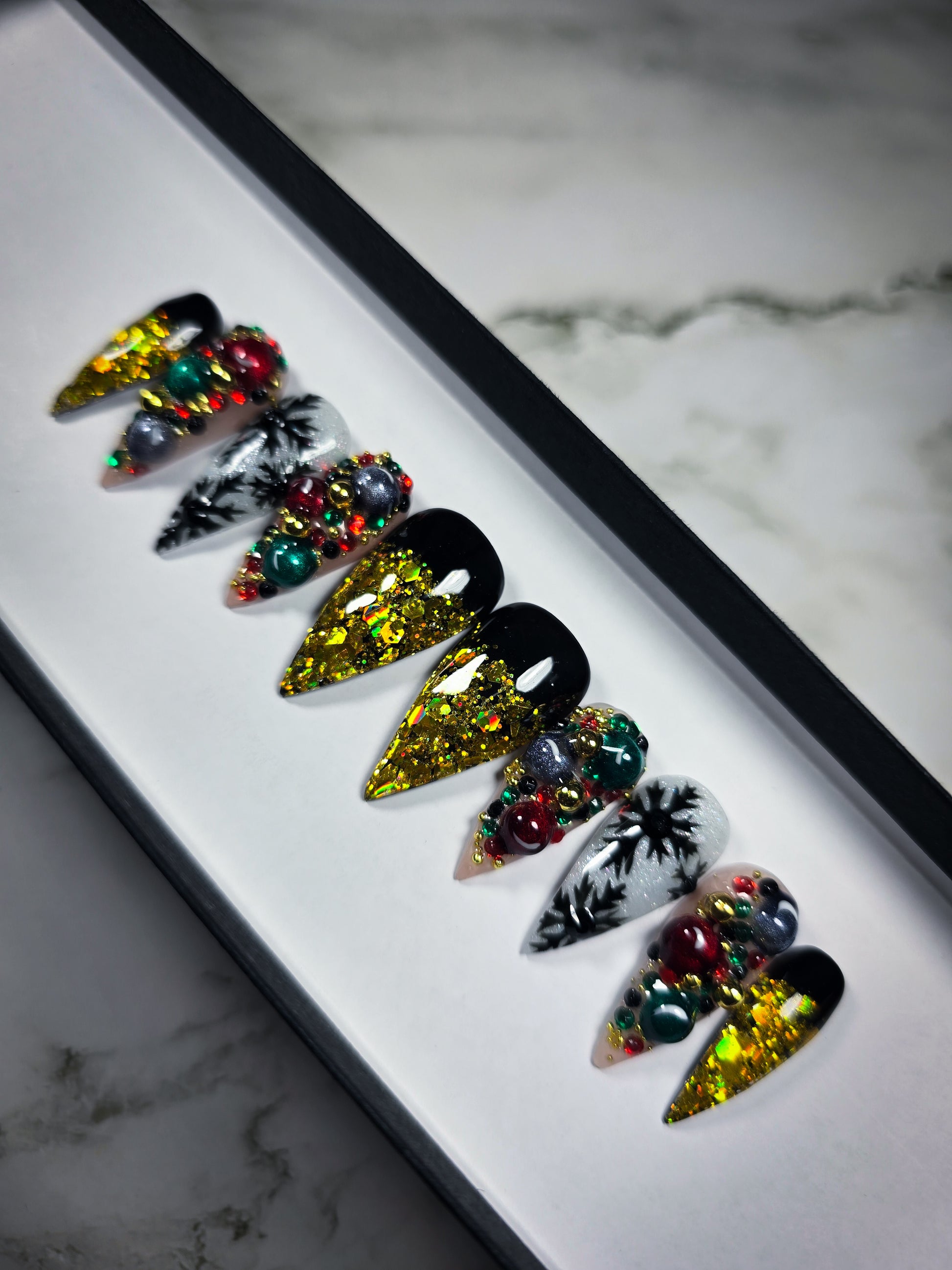 Add some rebellious spirit and sparkly style to your holiday look with my Spirit & Sparkle Press on Nail Set! Inspired by the festive season, but with a gothic twist, these nails will take your look to the next level. No need to wait for Santa, get these now for a bold and daring holiday!
