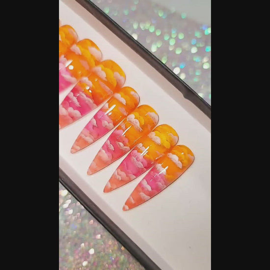 Summer Sunset is a stunning Jelly Ombre of Orange to two different tones of pink with gorgeous hand painted cloud nail art!