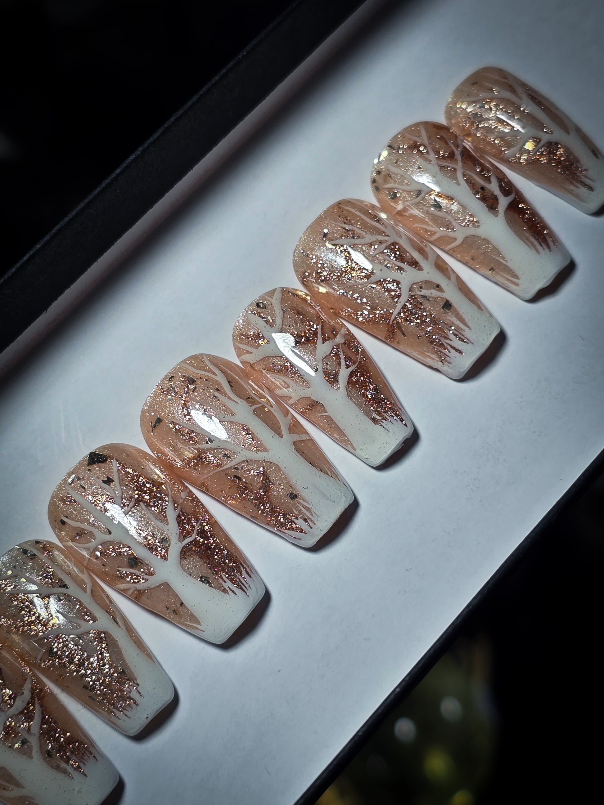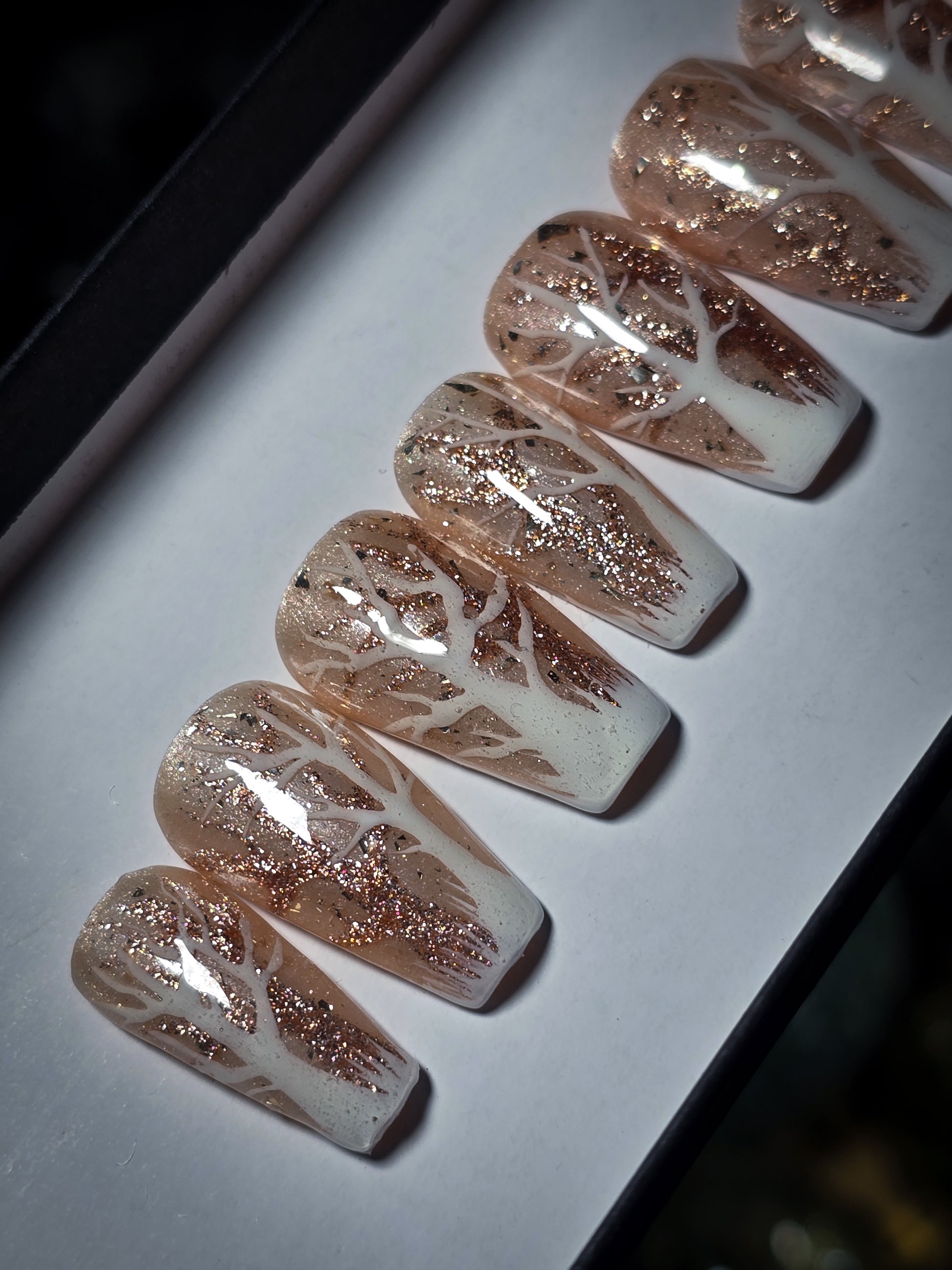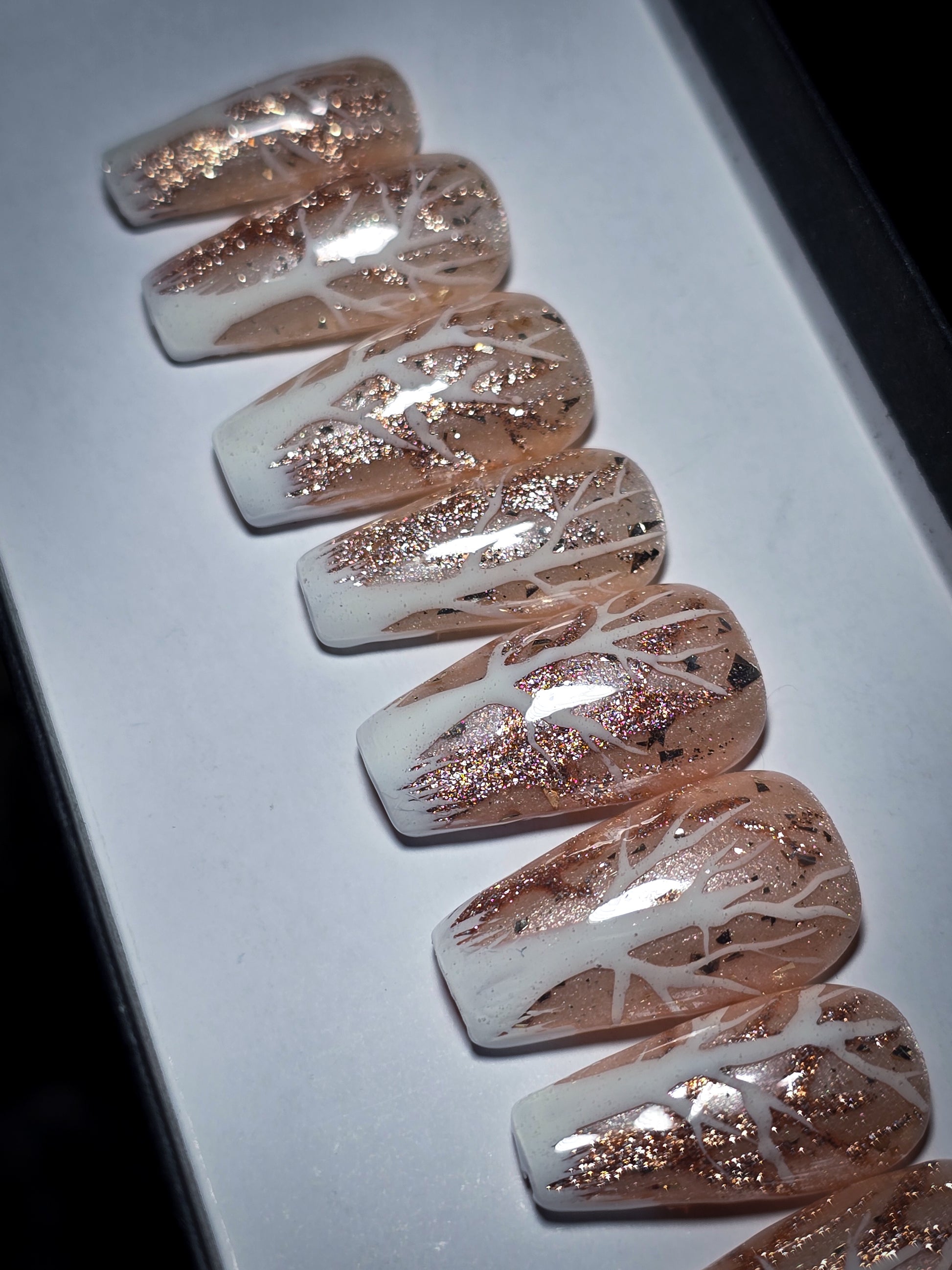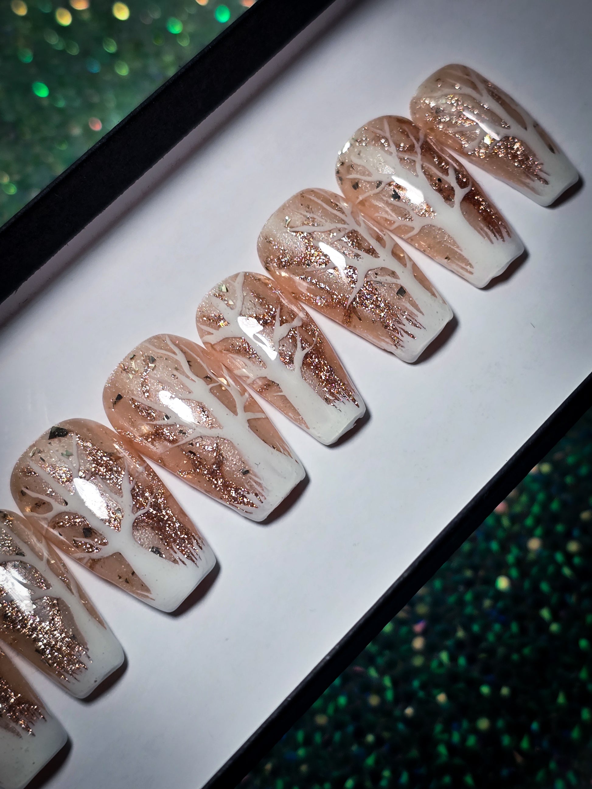 Embrace the magic of winter with these enchanting press-on nails featuring delicate white and glittering gold trees that whisper secrets across your fingertips. Each nail shimmers with seasonal charm, capturing the serene beauty of a frosted forest. Perfect for holiday parties, cozy nights in, or whenever you want to add a touch of sparkle to your look. Easy to apply, comfortable to wear, and absolutely stunning—your nails will be the talk of the season.